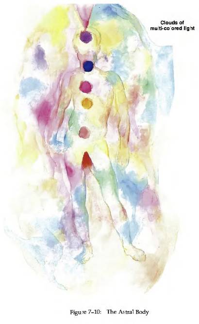 星光體(圖7-10)是無定形的,組成它的彩色雲團比情緒體的更美麗。星光體似乎有同樣的色彩集,但常常伴隨著愛的玫瑰色的光。它延伸出身體0.5~1英尺。脈輪與情緒體一樣是彩虹色,但每個脈輪都發出玫瑰色的光。