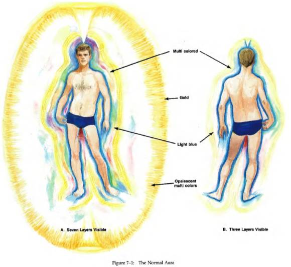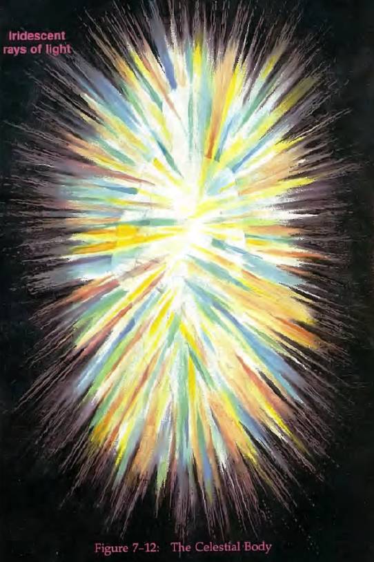 第六層是靈性層面的情感面,稱為精妙體(celestial body,圖7-12)。延伸到肉體外2~2.75英尺(約60~2125px)。在這一層,我們體驗到靈性狂喜。
