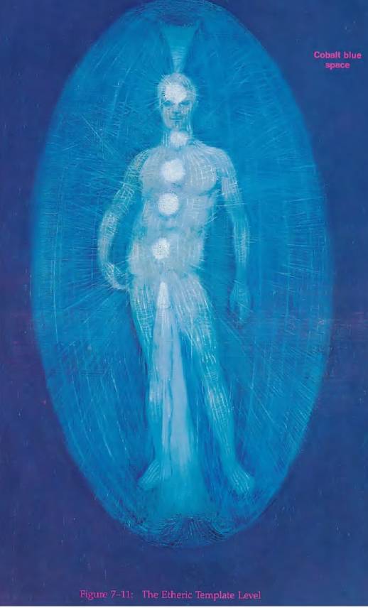 以太層的結構,從以太模板層獲取。它是以太層的藍圖或理想形式。它延伸到肉體外1.5~2英尺。生病時,當以太層有毀壞,就需要以太模板提供支持,以便以太層恢復到模板形式。在這一層,聲音創造物質。在這一層聲音療愈最有效。在第23章會有詳細討論。在我的靈視中,這層身體像是鈷藍色背景上的亮線或透明線,很像建築師的藍圖,只不過它存在於其它維度。它似乎完全填充了背景,而空餘的空間用於創造形狀。